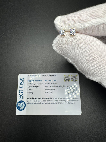 All certified lab diamond studs listed are in the colorless to near colorless color range and VS-VVS Clarity.