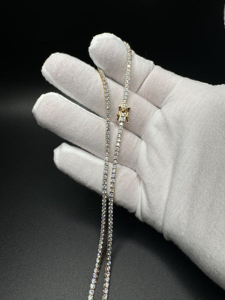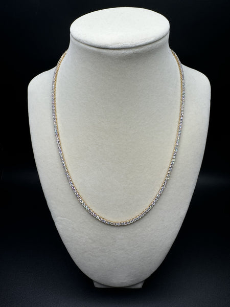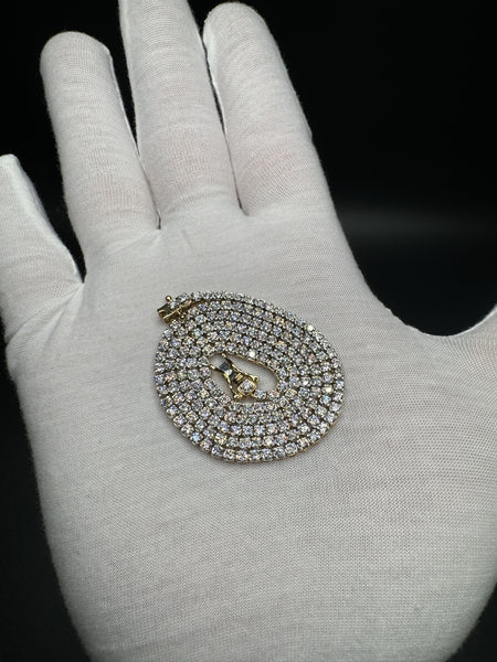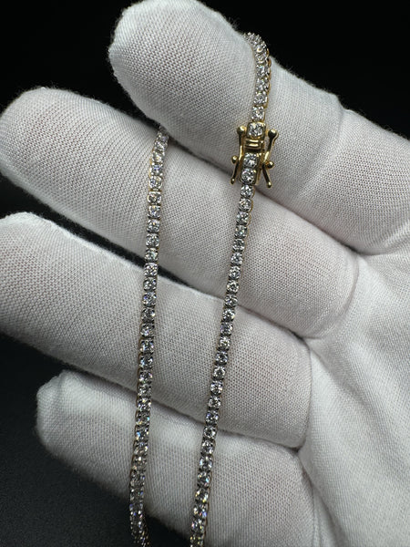 This gold over silver tennis chain packs 7 carats of VS/VVS lab diamonds into a sleek 2.6mm, 11.9 gram design. The gold overlay gives it that rich, warm finish while keeping the price accessible.