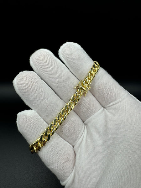 This 14k yellow gold Cuban link bracelet is a heavyweight statement piece that commands attention. At 28.2 grams of solid 14-karat gold packed into a 7.5-inch length with a bold 7mm width, this bracelet has serious presence on the wrist. The flat, polished Miami Cuban links catch light from every angle, delivering that classic look that never goes out of style.