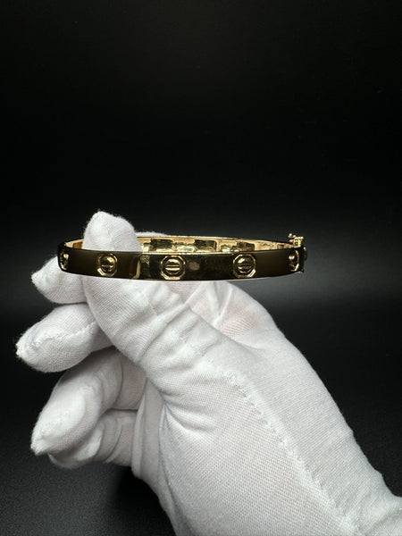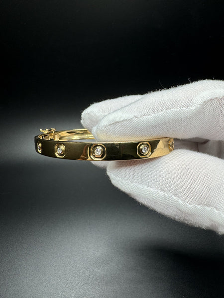 Elevate your wrist game with this gorgeous Gold over Silver Love style bangle, adorned with 1/4ctw VS/VVS lab diamonds. Weighing 18.55g with a 7mm width, this bangle delivers a luxurious feel and unmistakable presence.