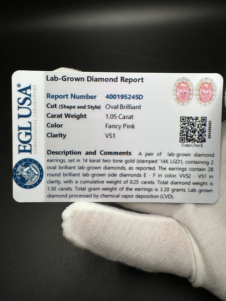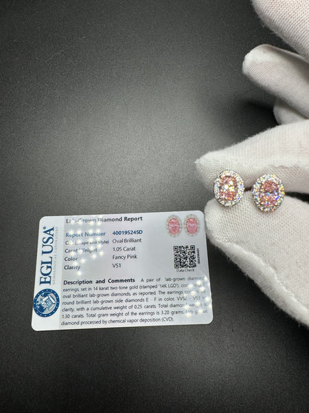 9x7mm 14k White Gold EGL Certified 1.05ctw Fancy Pink VS1 Oval Lab Diamond Studs with .25ctw E VVS2 Lab Diamond Halo 3.3g