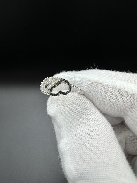 Size 7 10k White Gold Ying Yang Style 2 Heart Black & White Diamond Ring 1.6g