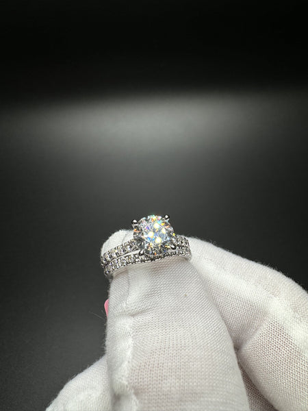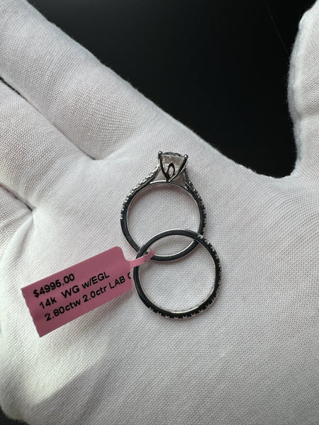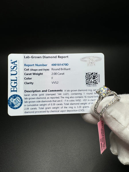 Size 7 14k White Gold 2.8ctw Lab Diamond Engagement Set — 2ct F VVS2 Round Center & .8ctw E VVS2 Diamonds on Band — EGL Certified — 5.2g