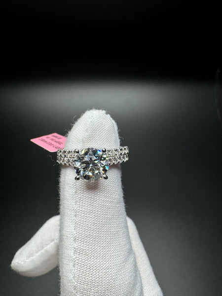 A stunning engagement set featuring a dazzling 2 carat F color VVS2 clarity round brilliant lab diamond center stone complemented by .8ctw E VVS2 lab diamonds along the band. Set in solid 14k white gold and fully EGL certified. This complete set gives you the engagement ring and wedding band in one gorgeous package — ready for the big moment.